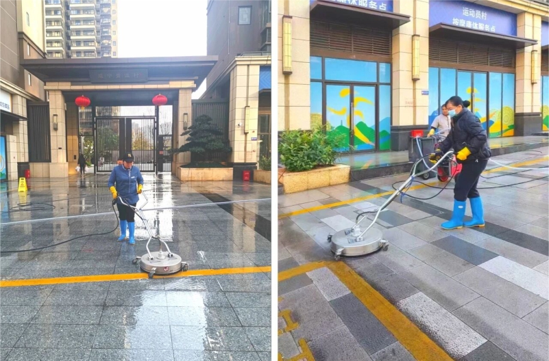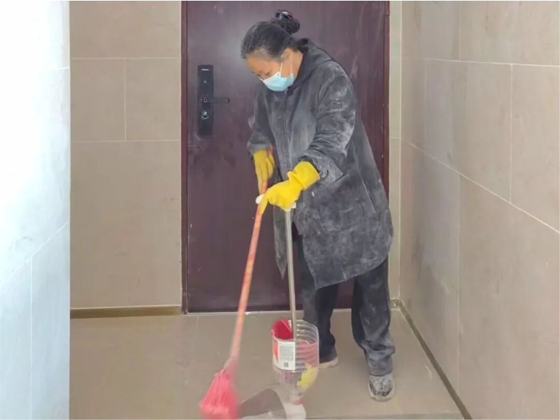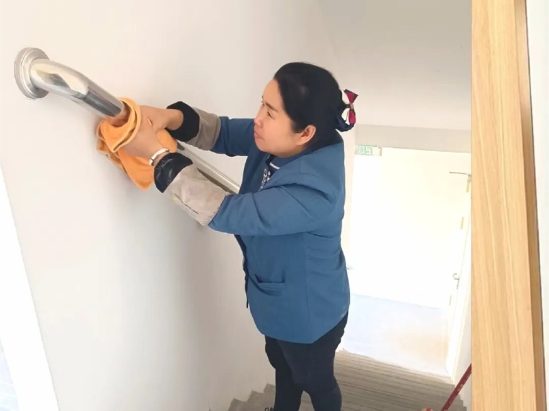 在楼栋卫生清洁方面,保洁人员每日逐层清扫楼梯、走廊,擦拭扶手、栏杆,清理楼道内的杂物。