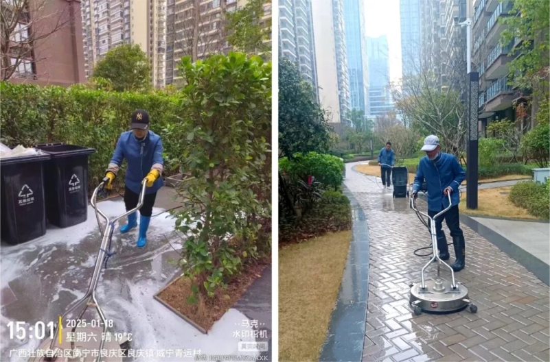 为将公共区域积淀的污垢以及隐匿在角落、极难清扫的污渍彻底根除,保洁团队对园区地面展开深度清洁作业,对边沟的淤泥及垃圾进行集中清理。
