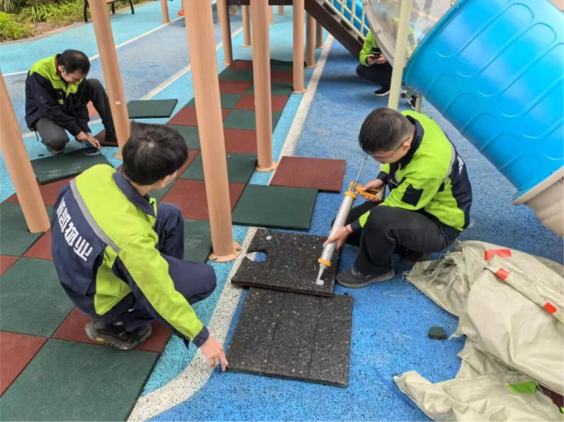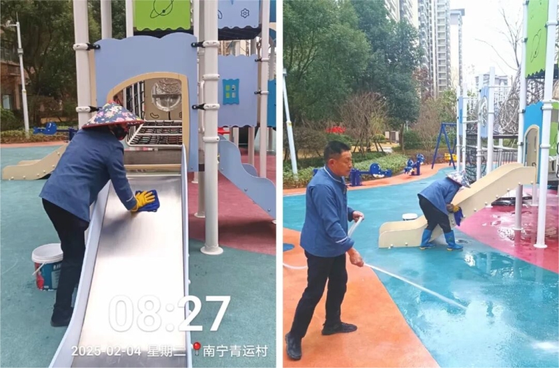 在儿童游乐区、健身设施区域等重点区域,保洁人员增加清洁频次,及时清理周边的纸屑、饮料瓶等杂物。同时,对游乐设施和健身器材进行每日消毒擦拭。