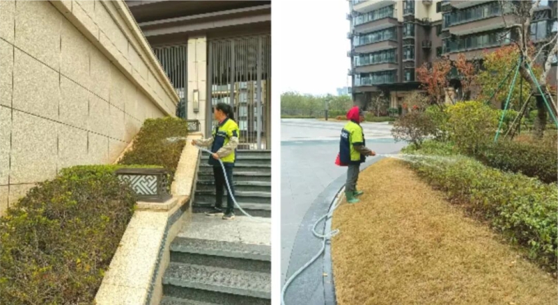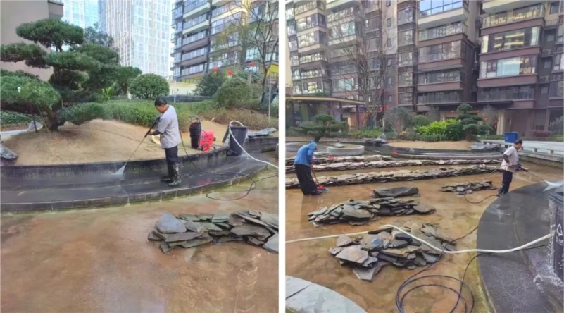 景观水池进行了全面清洗,彻底清除了水池内壁和底部附着的青苔与污垢,仔细打捞出了池中的枯枝树叶等杂物,水池以崭新的澄澈面貌呈现在业主眼前 。