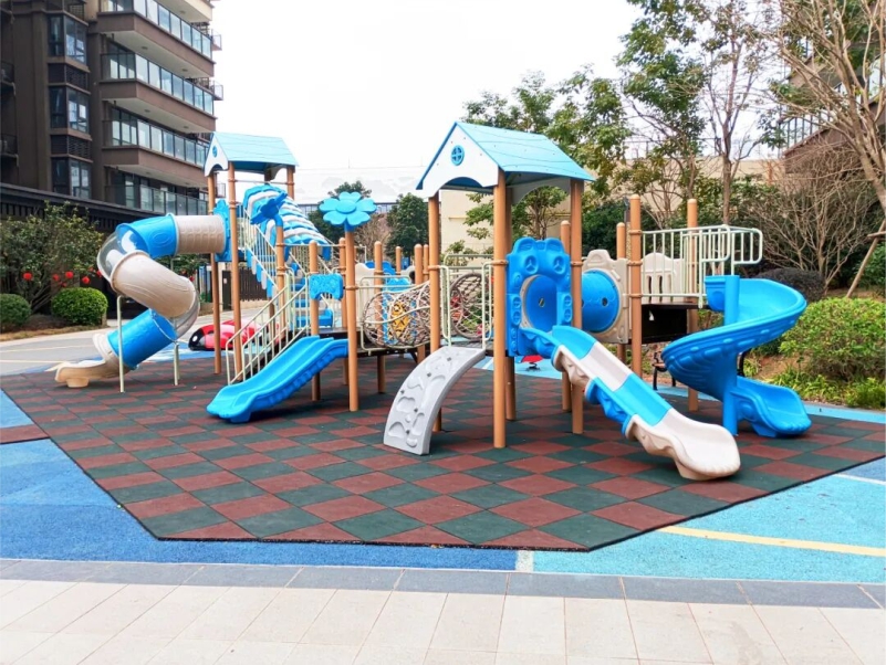 儿童游乐设施在原本的水泥地上铺设了更安全,更规范,适合跑跳类运动的塑胶地面。