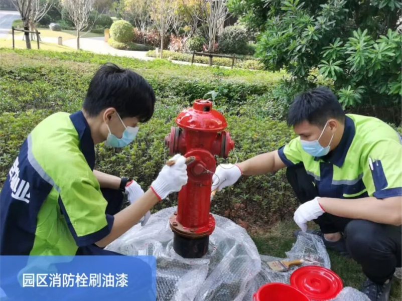 对园区内的消防管道、室外消火栓等设施设备进行除锈刷漆维护保养工作。